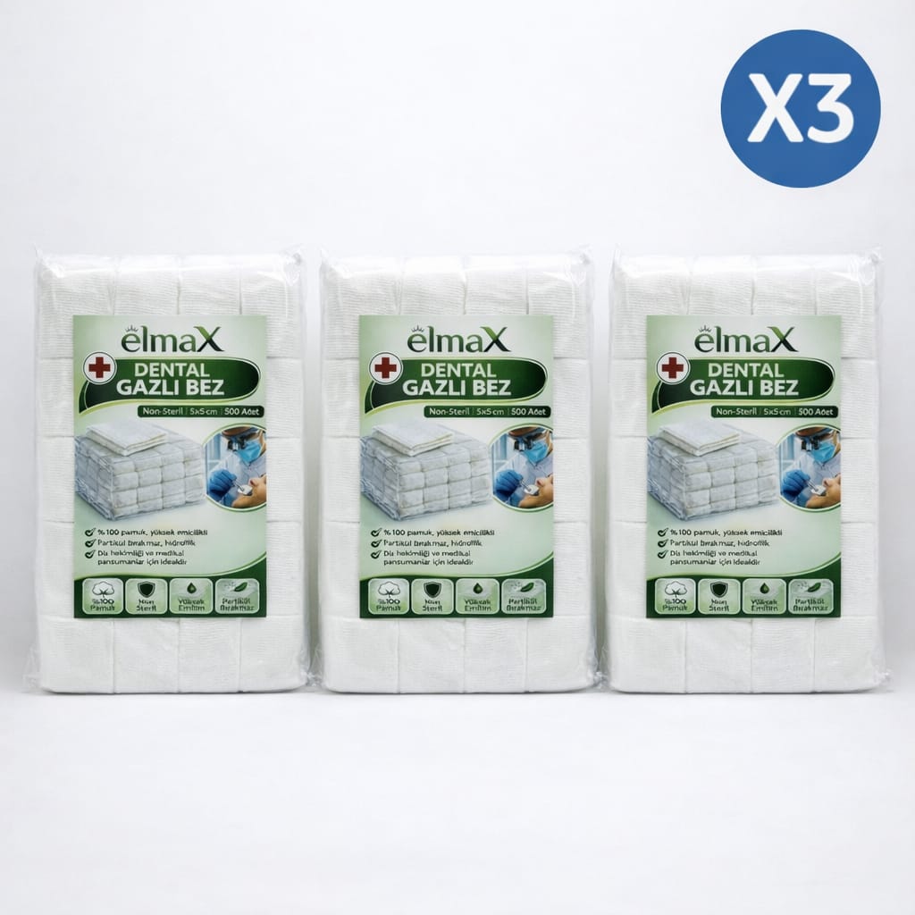 elmaX Dental Gazlı Bez, diş hekimliği ve medikal pansuman uygulamaları için özel olarak üretilmiş, yüksek emiciliğe sahip non-steril gazlı bezdir. %100 pamuk yapısı sayesinde güçlü sıvı emme kapasitesi sunar ve uygulama sırasında partikül bırakmaz.