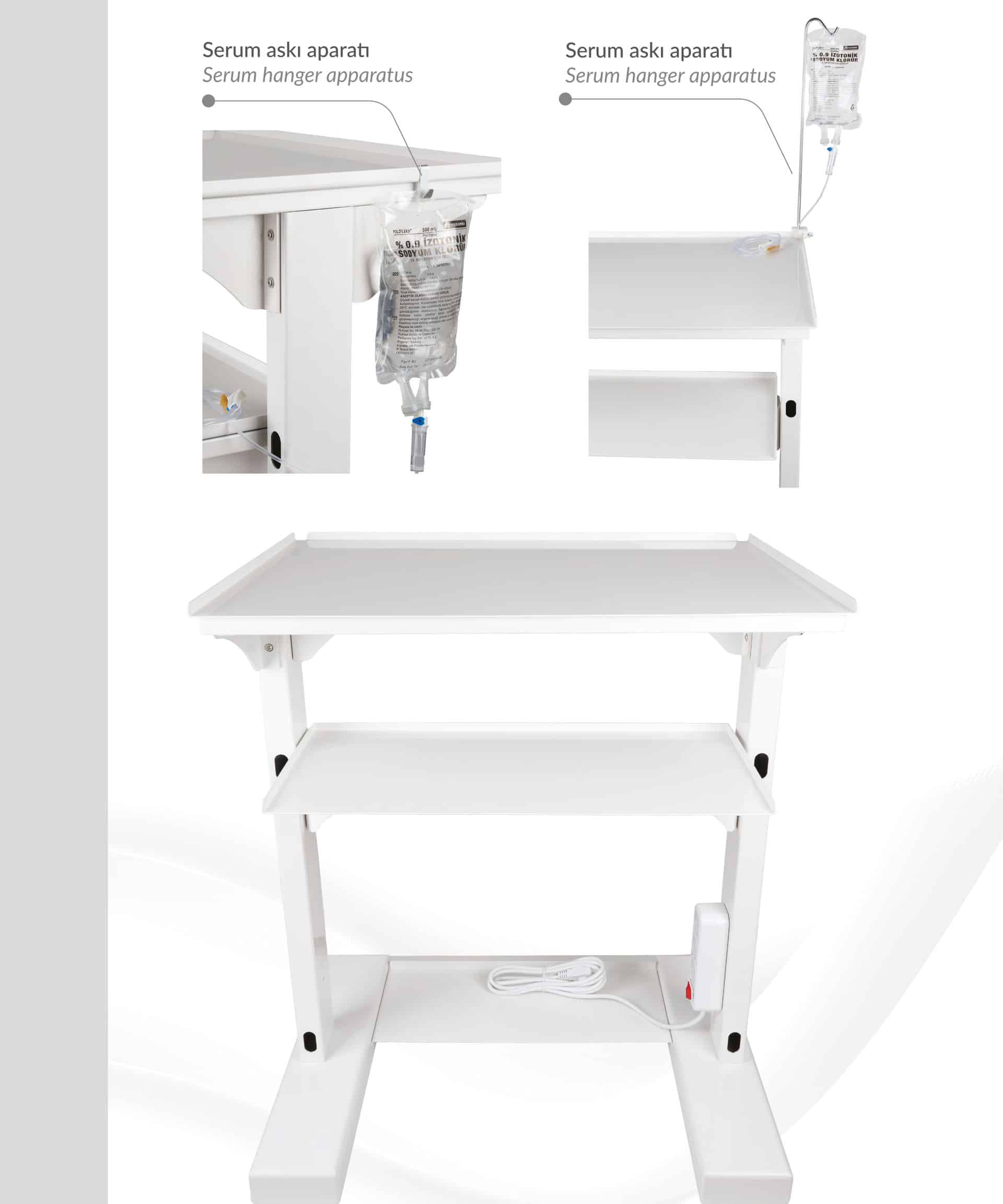 HCR-01 Cerrahi Sehpa, ameliyathaneler ve cerrahi ortamlar için özel olarak tasarlanmıştır. Lazer kesim profil ve DKP sac yapısı, birden fazla cihazı barındırabilen geniş tepsileri, gizli tekerlekleri ve entegre kablo yönetimi ile güvenli ve verimli bir kullanım sunar. Serum askısı dahildir.
