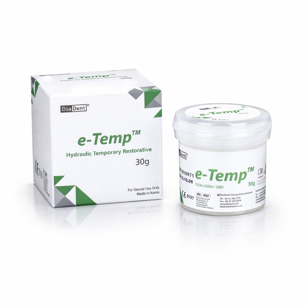 Çinko oksit ve kalsiyum sülfat içeriği sayesinde biyouyumlu yapıya sahip olan DiaDent E-Temp, yaklaşık 25 dakika veya daha kısa sürede sertleşerek klinik kullanımda zaman kazandırır. Kolay uygulanabilir yapısı ve işlem sonrası rahatlıkla çıkarılabilmesi ile diş hekimleri için ideal bir geçici dolgu materyalidir.