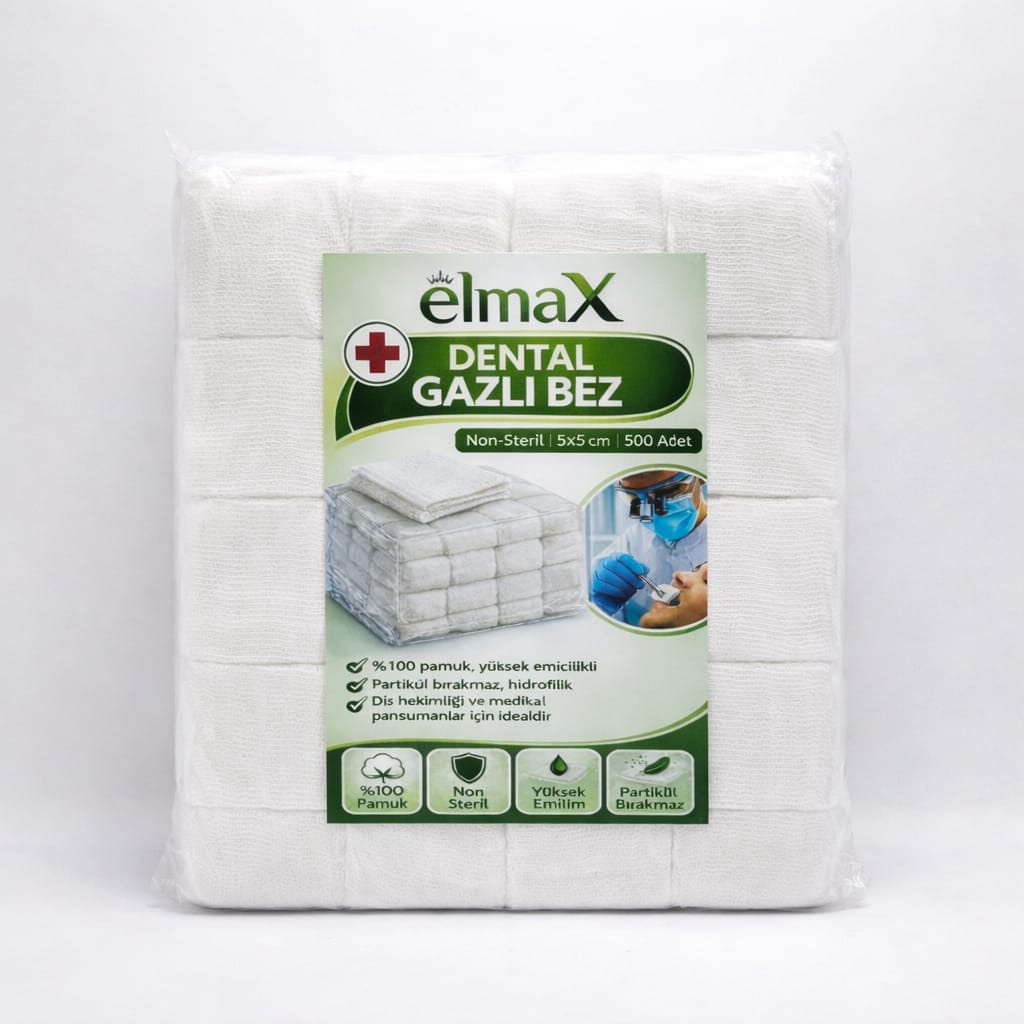 elmaX Dental Gazlı Bez, diş hekimliği ve medikal pansuman uygulamaları için özel olarak üretilmiş, yüksek emiciliğe sahip non-steril gazlı bezdir. %100 pamuk yapısı sayesinde güçlü sıvı emme kapasitesi sunar ve uygulama sırasında partikül bırakmaz.