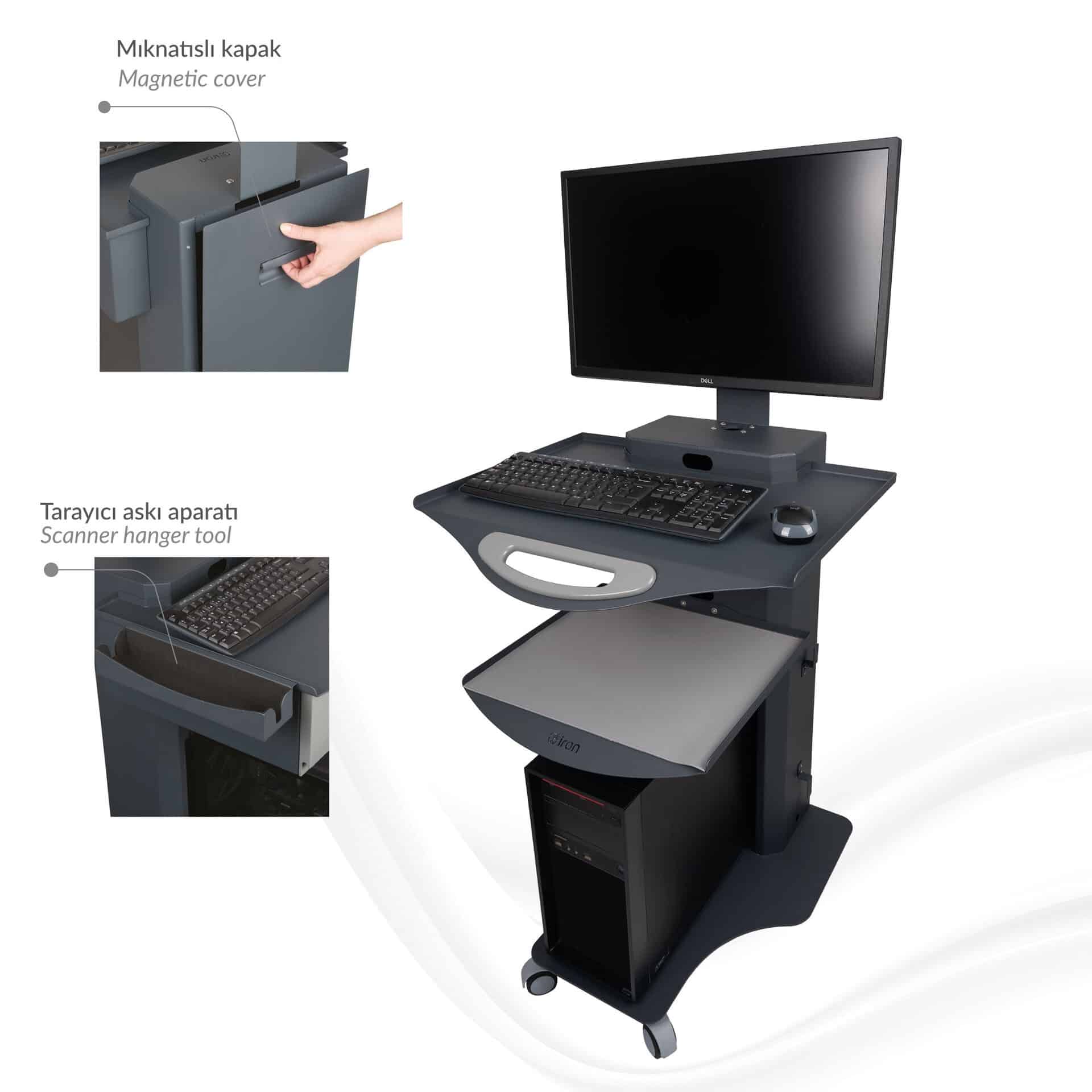 HKS-01 Kasalı Bilgisayar Sehpası, medikal ortamlar için özel olarak tasarlanmıştır. Standart ATX kasalarla uyumlu yapısı, hareketli monitör askı aparatı ve gizli kablo yönetimi ile düzenli ve fonksiyonel bir çalışma alanı sunar.