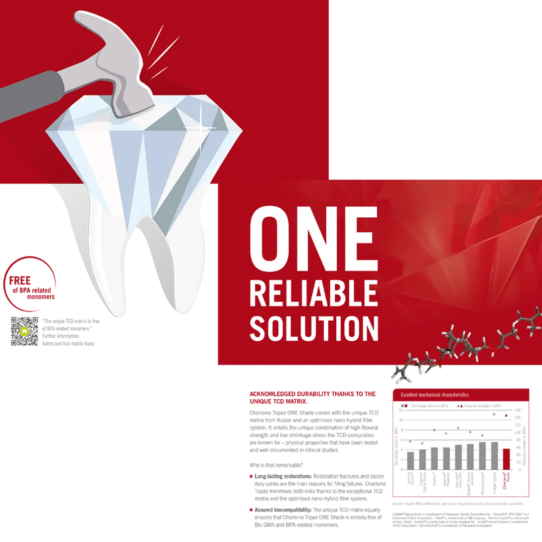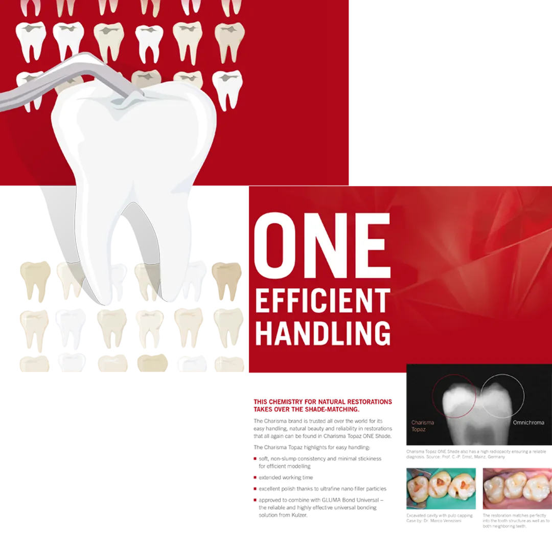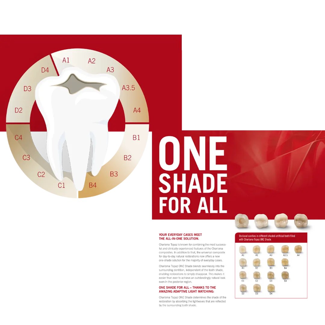 Charisma Topaz ONE, Bukalemun Kompozit gelişmiş mekanik ve estetik özelliklere sahip günlük vakaların neredeyse tamamı için gerçekten universal renk çözümleri sunan restoratif dolgu materyalidir.