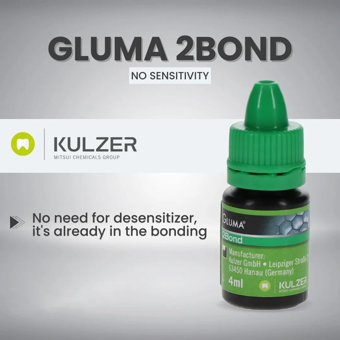 Yapışma mukavemeti nedeniyle, GLUMA 2Bond her tür restorasyon için uygundur. Yeni 5. nesil yapıştırma sistemi modern nanodolduruculara dayanmaktadır. GLUMA 2Bond, mine ve dentine mükemmel yapışma sağlar, ayrıca optimal kenar sızdırmazlık oluşturur. Ayrıca, GLUMA 2Bond, klinikte 10 yıldan fazla süredir klinik olarak başarılı olduğu kanıtlanmış bir glutardialdehit ürünü olan GLUMA Duyarsızlaştırıcı ajanını içerir. GLUMA 2Bond, hassas hastalar veya aşırı duyarlı bölgelerin duyarsızlaştırılması için idealdir.