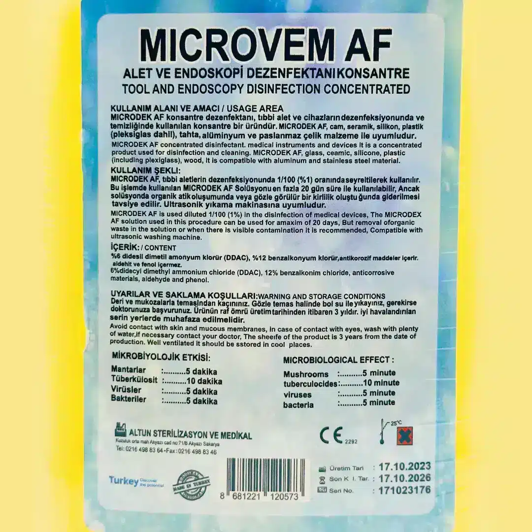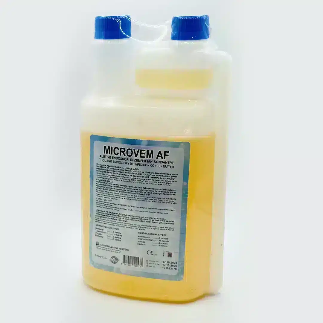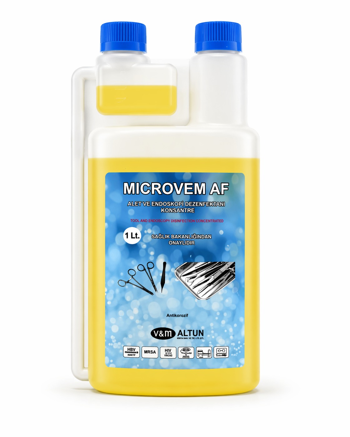MİCROVEM AF, konsantre dezenfektanı, tıbbi alet, endoskopi, diş hekimliği aletleri ve firezler, kanal eğeleri cihazların dezenfektasyonunda ve temizliğinde kullanılan bir üründür.