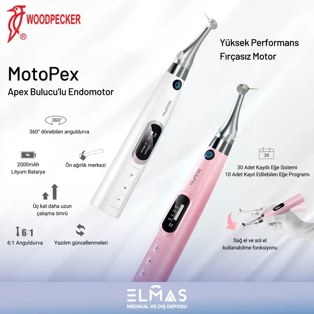 Woodpecker Motopex cihazı, endodonti tedavisinde kullanılan apex locaterli endodontik motor son teknoloji ile geliştirilmiş bir üründür. Cihaz anatomik apexi ölçebilme, 360 derece dönebilen rotary sistem ve reciprocal hareketi kendi bünyesinde çalıştırabilme özelliğine sahip olup, bu özellikler tek tek veya hepsi bir arada da kullanılabilir.
