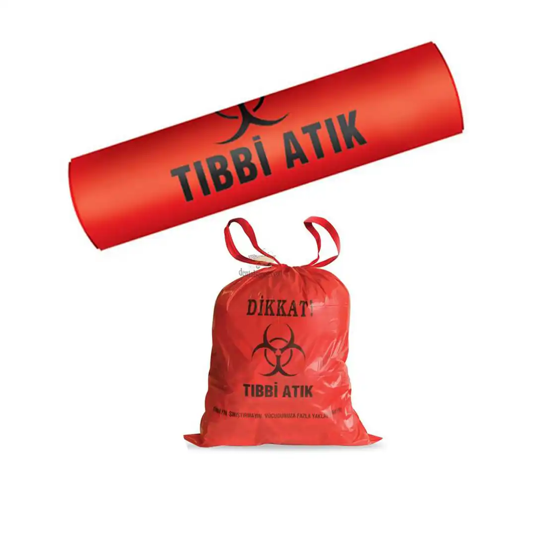 Poşet üzerinde ” TIBBİ ATIK ” yazısı ve Uluslararası Tıbbi Atık İşareti bulunmaktadır.