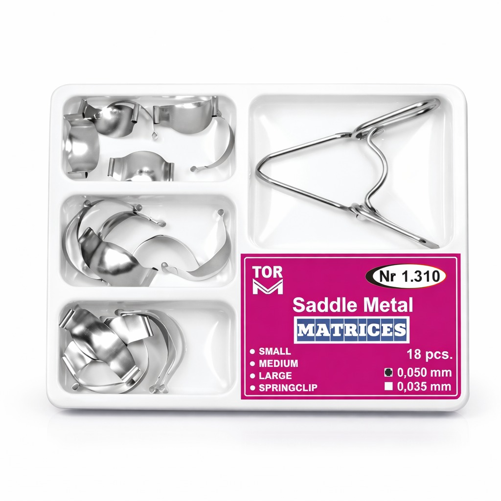 Tor VM Saddle Matrix Bandı Seti, posterior restorasyonlarda ideal anatomik form ve güçlü temas noktaları oluşturmak için geliştirilmiş çevresel konturlu metal matriks sistemidir. Farklı boyut seçenekleri sayesinde dişe mükemmel uyum sağlar ve restorasyon kalitesini artırır.